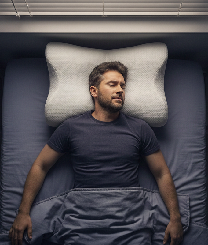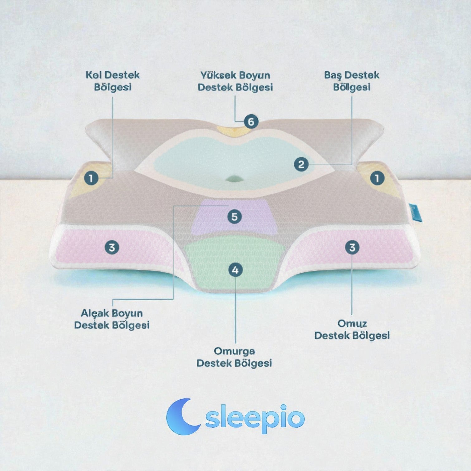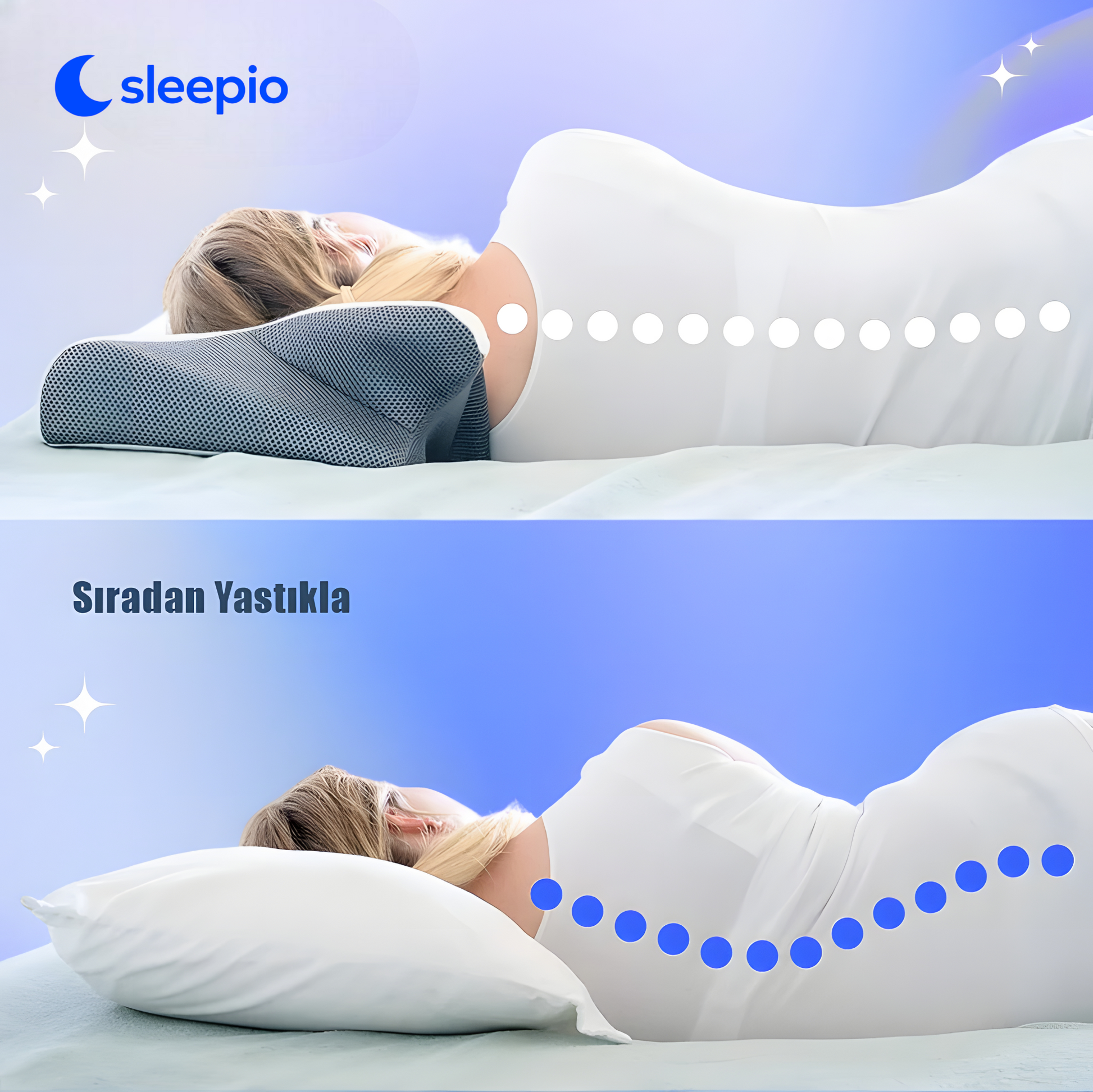 Sleepio'nun özel olarak tasarlanmış şekli baş ve boyun bölgesini doğal pozisyonda destekler🛏️✨ Uyku sırasında basıncı dengeli şekilde dağıtarak kasların gevşemesine yardımcı olur💤 Bu sayede daha sağlıklı bir uyku sunar ve baş ile boyun ağrılarının azalmasına katkı sağlar 😴💆♂️